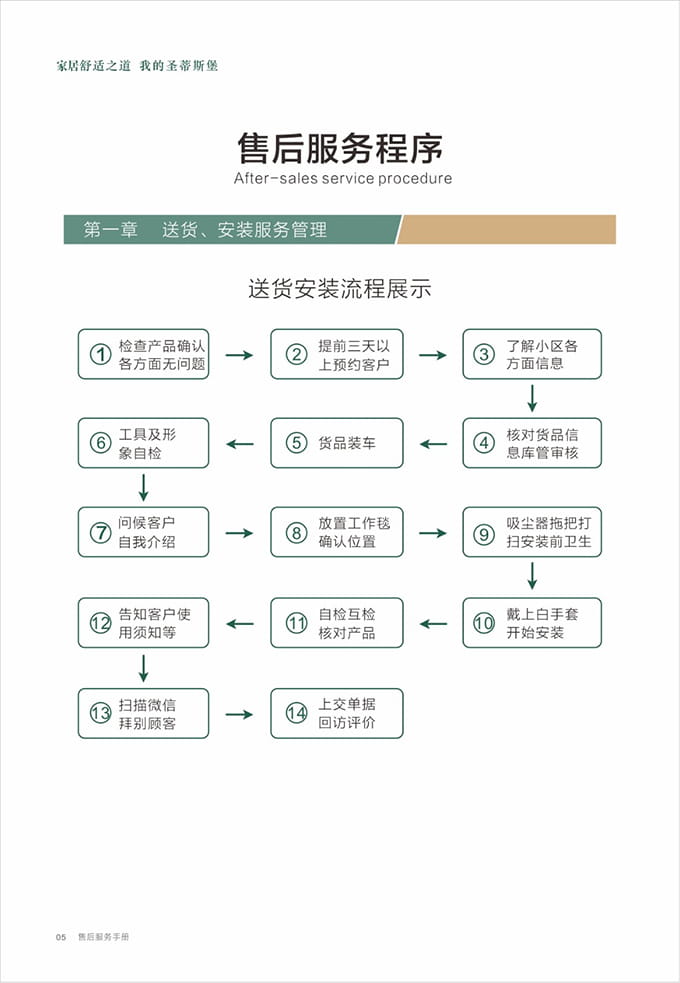 物資準(zhǔn)備:上門前必須著圣蒂斯堡統(tǒng)一工作服,佩戴工作證,準(zhǔn)備好安裝工具、搬抬工具(搬運(yùn)背帶等)、備件、筆記本、手套、鞋套、地墊、衛(wèi)生清掃工具(清潔劑、抹布、掃把簸箕、拖把、吸塵器等)、瓶裝水、《圣蒂斯堡安裝施工指示牌》、收據(jù)和圣蒂斯堡產(chǎn)品說明書、《產(chǎn)品配送單》和《配送滿意度調(diào)查表》等物品。再帶上小禮品,例:鮮花或碳包去味禮包等。