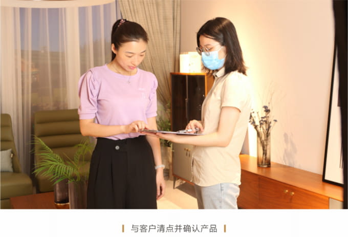 安裝并檢查完所有工作后,需與客戶清點(diǎn)并確認(rèn)產(chǎn)品,將所有帶電源的家具插上電源,告知客戶家具使用方法和功能及保養(yǎng)知識、注意事項(xiàng)等。所有帶功能的產(chǎn)品需演示給客戶看。例: