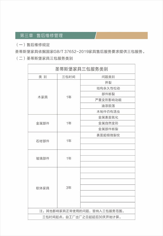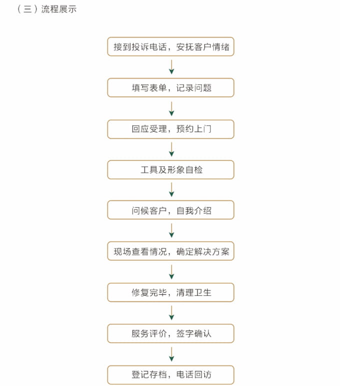 維修人員上門維修處理問題上門前必須著圣蒂斯堡統(tǒng)一工作服,佩戴上崗證并盡量攜帶維修處理過程中可能會使用到的工具和備用配件例:工具、備件、筆記本、手套、腳套、收據(jù)和《圣蒂斯堡售后服務(wù)信息單》等物品。