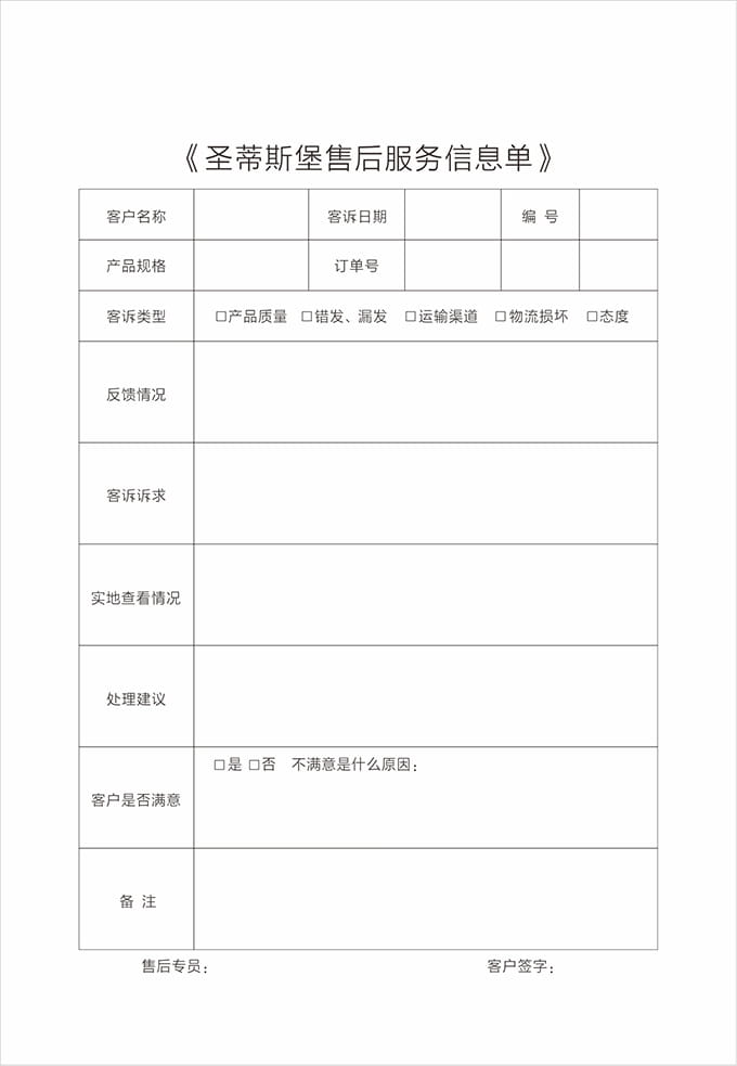 現(xiàn)場修復(fù)完成后,請客戶確認(rèn),在《圣蒂斯堡售后服務(wù)信息單》上簽字;不能現(xiàn)場修復(fù)時則必須跟客戶說明清楚,征得客戶同意后將產(chǎn)品帶回處理或返廠處理,應(yīng)開具相關(guān)收據(jù)交予顧客,并且登記備案;修理完畢后按照配送流程送到顧客家后應(yīng)向顧客索回收據(jù),并且請顧客在《圣蒂斯堡售后服務(wù)信息單》簽字。