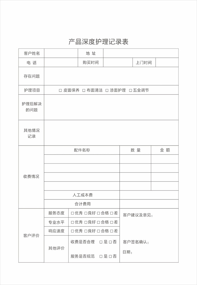按要求認(rèn)真填寫服務(wù)記錄單據(jù)并請顧客填寫相應(yīng)內(nèi)容及簽字,離開顧客處時除了與顧客本人告別外,還需要向有關(guān)負(fù)責(zé)人打招呼,詢問是否還有其他問題,當(dāng)?shù)玫筋櫩偷臐M意允許后,方可離開。